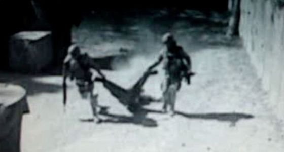 Dos soldados arrastran el cuerpo del terrorista. Imágenes del vídeo emitido por Antena 3.