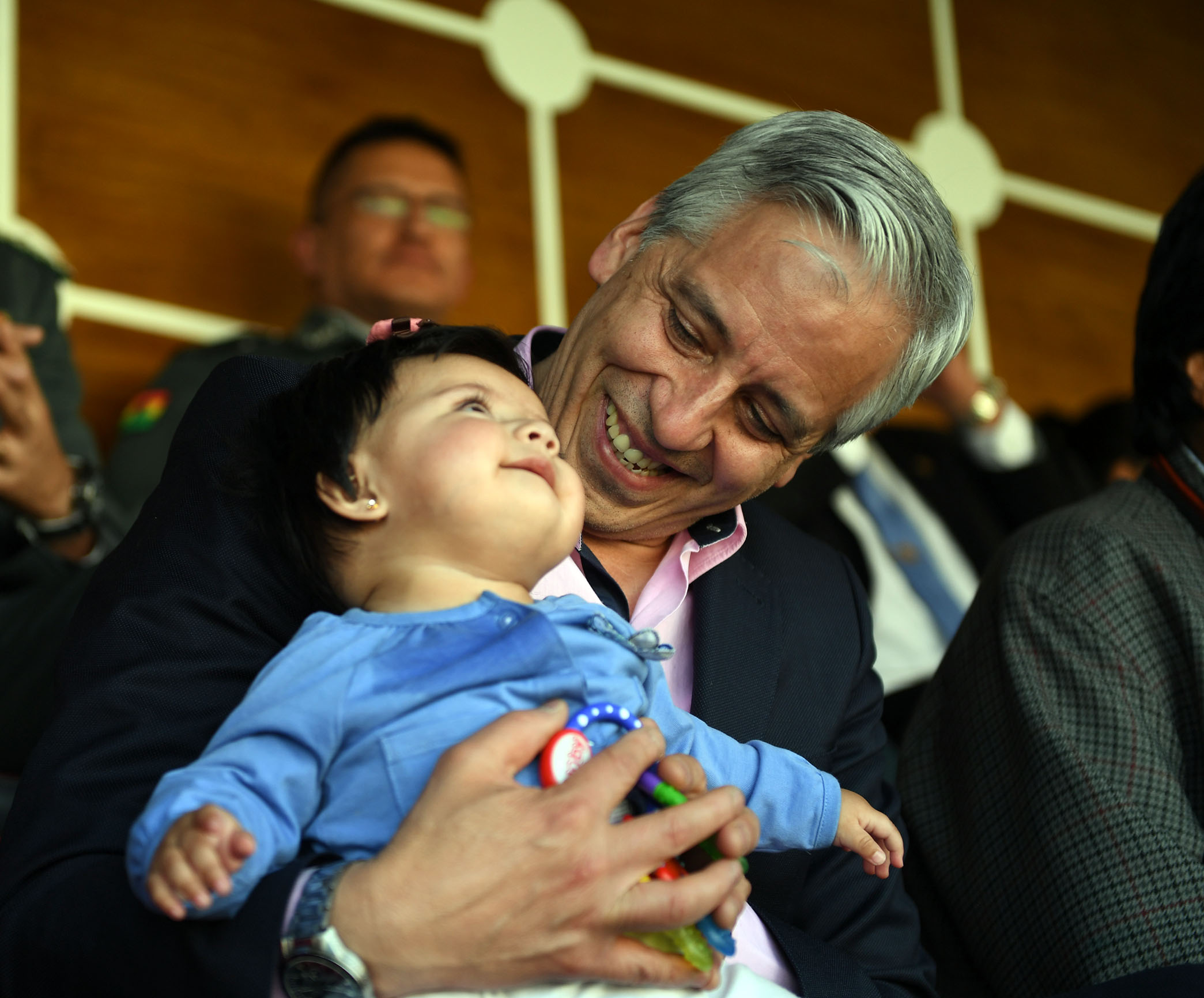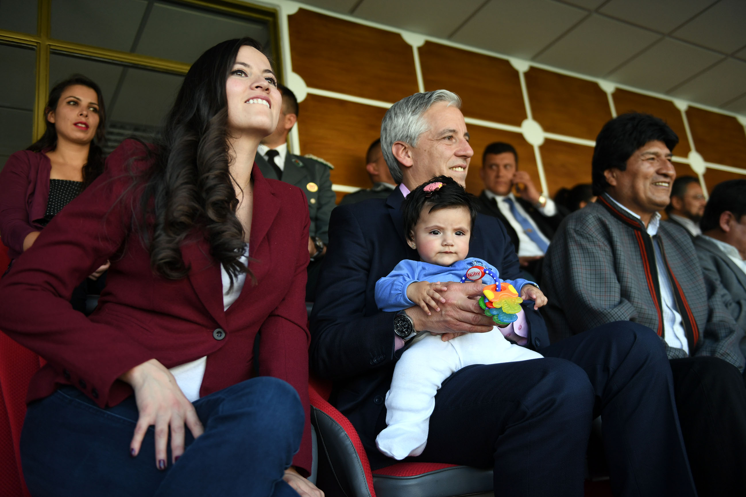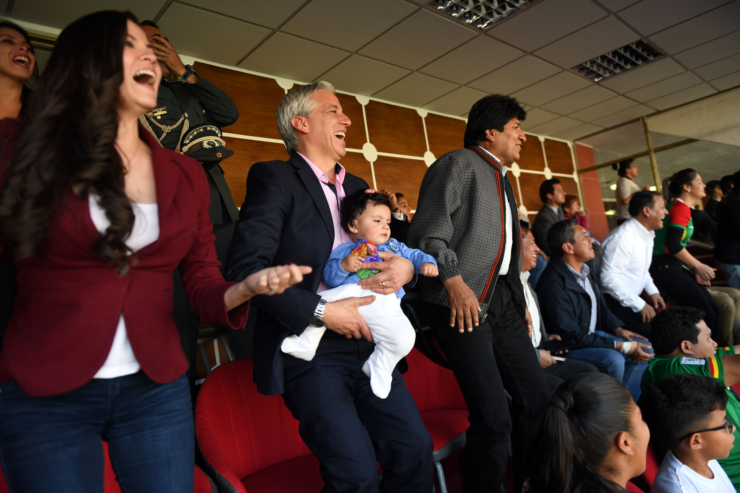 La Paz.- Ayer. El Presidente Morales y el vicepresidente Garcia Linera, su esposa Claudia y su hija, Alba, en el palco oficial “sufren” el partido entre las selecciones de Bolivia y Brasil. (Fotos ABI)El poder político concurrió ayer al estadio para alentar a Bolivia que no pudo con Brasil y terminó en un empate que tampoco tuvo sabor a victoria para los visitantes que no solo querían mantener el invicto sino ganar venciendo al fantasma de la altura de La Paz, pero eso es tema de la prensa deportiva, el asunto es Alba, que ha empezado a aparecer cada vez con más frecuencia en actos públicos, “robando cámara” a su famosos papás.Alba es, por ahora, la única hija del vicepresidente Álvaro García con la presentadora de televisión, Claudia Fernández. Ambos han decidido hacer participar de la vida pública a su pequeña que aún no cumple su primer año de vida, según se evidencia por la aparición de la bebe en actos oficiales no solo en La Paz sino también en otras ciudades del país. Un hecho que, sin duda, ayuda a sustentar la “imagen” del segundo mandatario del país, hoy empeñado al igual que Evo, en la repostulación indefinida.La pequeña Alba, ya se está acostumbrando a las multitudes y los “flashes” de los medios, según lo demostró ayer en el palco oficial del estadio Hernando Siles, donde se mantuvo tranquila en los brazos del papá y en otros momentos de la mamá, mientras el “griterio” de la emoción deportiva hacia presa de los concurrentes. No se sabe si en algún rato el “tío” Evo se animó a cargarla en sus brazos. (eju.tv / L.M.)