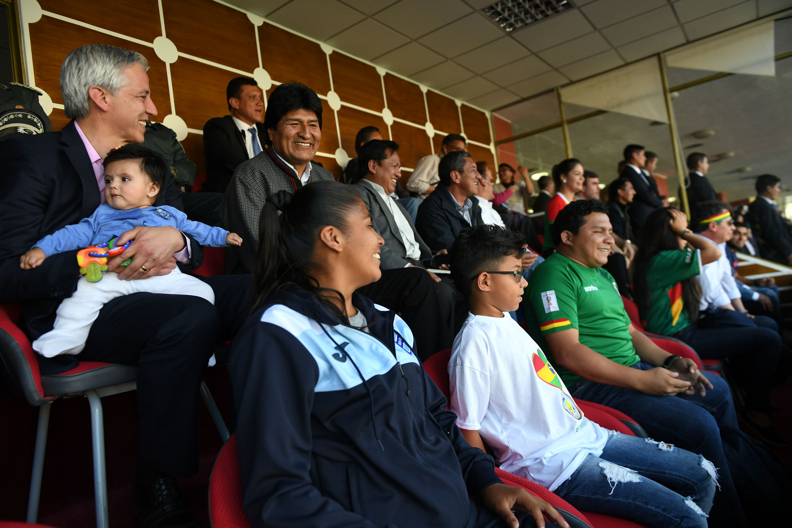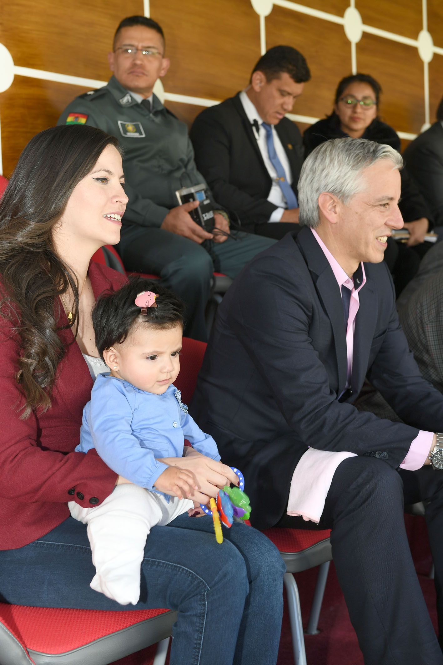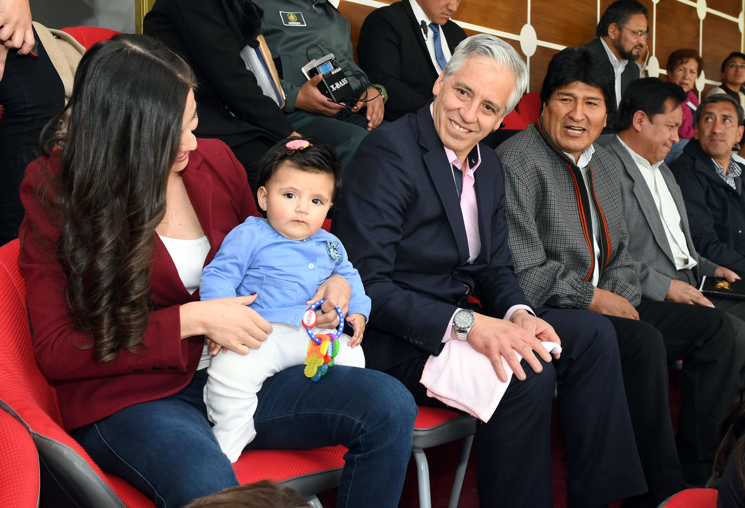 La Paz.- Ayer. El Presidente Morales y el vicepresidente Garcia Linera, su esposa Claudia y su hija, Alba, en el palco oficial “sufren” el partido entre las selecciones de Bolivia y Brasil. (Fotos ABI)El poder político concurrió ayer al estadio para alentar a Bolivia que no pudo con Brasil y terminó en un empate que tampoco tuvo sabor a victoria para los visitantes que no solo querían mantener el invicto sino ganar venciendo al fantasma de la altura de La Paz, pero eso es tema de la prensa deportiva, el asunto es Alba, que ha empezado a aparecer cada vez con más frecuencia en actos públicos, “robando cámara” a su famosos papás.Alba es, por ahora, la única hija del vicepresidente Álvaro García con la presentadora de televisión, Claudia Fernández. Ambos han decidido hacer participar de la vida pública a su pequeña que aún no cumple su primer año de vida, según se evidencia por la aparición de la bebe en actos oficiales no solo en La Paz sino también en otras ciudades del país. Un hecho que, sin duda, ayuda a sustentar la “imagen” del segundo mandatario del país, hoy empeñado al igual que Evo, en la repostulación indefinida.La pequeña Alba, ya se está acostumbrando a las multitudes y los “flashes” de los medios, según lo demostró ayer en el palco oficial del estadio Hernando Siles, donde se mantuvo tranquila en los brazos del papá y en otros momentos de la mamá, mientras el “griterio” de la emoción deportiva hacia presa de los concurrentes. No se sabe si en algún rato el “tío” Evo se animó a cargarla en sus brazos. (eju.tv / L.M.)