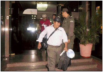 Evidencias. Peritos en balística que vinieron de La Paz, cuando salían del hotel Las Américas después de levantar las pruebas (El Deber)