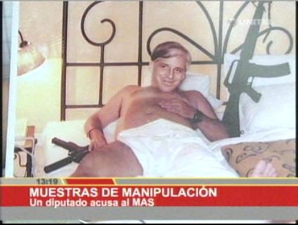 Diputado Añez hace un montaje de la supuesta foto de Eduardo Rozsa en el hotel Buganvillas mostrando en su lugar al vicepresidente García Linera. Noticias de TV: Unitel
