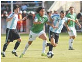 El ariete Marcelo Martins domina el balón ante la marca de dos argentinos, fue en el 6-1 que los bolivianos propinaron a los albicelestes.
