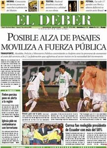 Portada => Recibir por Whatsapp las noticias destacadas Posible alza de pasajes moviliza a fuerza pública Policías y gendarmes no dejarán que se cobre Bs 2 A partir de hoy los transportistas instruyeron que se cobre Bs. 2 el pasaje en las 118 líneas que recorren la ciudad, ante la imposibilidad de consensuar una nueva tarifa con las autoridades municipales. Editorial