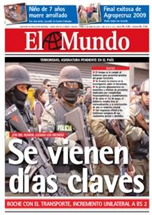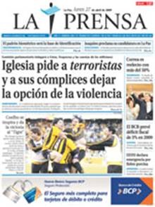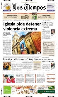 Iglesia pide detener violencia extrema El cardenal Julio Terrazas pidió ayer en Cochabamba a los bolivianos a no contaminarse con lo que viene ocurriendo en el país, especialmente “con ese terrorismo que no trae nada bueno a nadie”, dijo el purpurado a tiempo de agradecer a la comunidad católica por el apoyo que le brindó luego de que su vivienda en Santa Cruz sufriera un atentado con artefacto explosivo. Editorial Represión en las propias filas Los masistas también tendrán, como los opositores, que aprender a vivir bajo el signo del miedo. Y no podrán decir que no se les advirtió. Como ya es habitual cada que tienen que tomar decisiones importantes, durante el pasado fin de semana los dirigentes de las organizaciones sociales que apoyan al Movimiento al Socialismo se reunieron en Cochabamba para definir un plan de acción para el futuro inmediato.