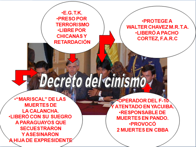 Dijo que “el Ministro de la Presidencia, responsable de los casos de terrorismo de Estado en Yacuiba, Cochabamba y Pando y el Ministro de Gobierno responsable de las muertes en la Calancha y de la liberación de los terroristas paraguayos que secuestraron y asesinaron a la hija del ex presidente de Paraguay, no tienen moral para decirnos que quieren luchar contra el terrorismo”.