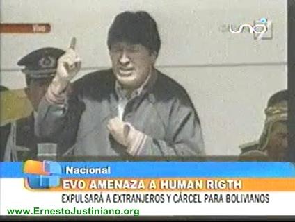 "En la dura investigación sobre algunos separatistas encontramos una fundación llamada Human Rights que trabaja con extranjeros que vienen a dirigir Bolivia. (…) Si siguen, estos extranjeros tendrían que irse y los bolivianos metidos acá deberían ir a la cárcel", dijo el presidente.