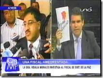 Comentario J. Arandia: “No sabe la nochecita que tuvimos ayer, tras la entrevista a la Dra. Vidalia Morales que está investigando al Fiscal de Distrito del Departamento de La Paz. La Dra. Morales mostró papeles muy comprometedores de la supuesta participación del actual Fiscal de Distrito de La Paz en la dictadura del ’80 con García Meza como informante de la parte de las minas, designación del DIN de ese entonces. Esto obviamente enfureció al Fiscal de Distrito de La Paz, a quien en nuestro afán periodístico invitamos a la contraparte en esta jornada, pero nos dijo, que el día jueves estará.