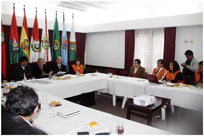 Presidente Evo Morales y Vicepresidente Álvaro García, el binomio oficialista, en la reunión con vocales del Órgano Electoral el 8 de octubre (Foto Abi)
