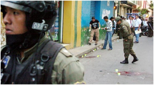 La Policía inspecciona el lugar donde fue victimado ayer Jorge Alberto Guzmán, presunto asesino de Álex Arteaga. (Los Tiempos)