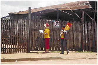 Campaña: Evo en helicóptero (izq). Los opositores a pie y de puerta a puerta como muestra la foto (der) tomada en Cobija de dos mujeres de la agrupación de Reyes Villa.
