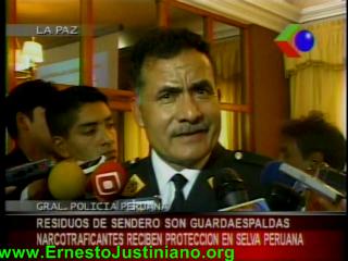 El Director Territorial de la Policía de Puno, Perú, General Horacio Antonio Huivín Grandez, llegó a nuestro país para intercambiar una serie de información con la Policía Boliviana Nacional. El General reconoció que existen residuos del grupo terrorista “Sendero Luminoso” operando en la selva de su país y que están actuando como guardaespaldas de los narcotraficantes del Perú.