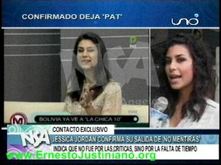 Entrevista a la Miss Bolivia 2007 y conductora de televisión, Jessica Jordan. “No hay mucho misterio con relación a mi salida del programa “No Mentirás”. Estoy agradecida con el programa por haberme dado la oportunidad de participar. Tengo muchos contratos que cumplir en el modelaje que vinieron antes del programa “No Mentirás”. No pude hacer las dos cosas juntas, porque tenía que viajar y cumplir con mis contratos y después tenía que volver al programa y hacerlo a medias. Eso no era justo para No Mentirás y tampoco para mí porque prácticamente no había tiempo. Por ahora tengo muchos compromisos, ya después analizaremos volver a la televisión”.