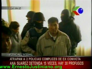 Cayeron dos policías cómplices de la ex convicta Ana Suárez y su banda de atracadores. Uno de los policías detenidos era miembro de inteligencia de la Policía Nacional que prestaba sus servicios en la Zona Sur de la ciudad de La Paz y donde ocurrieron los mayores atracos de esta peligrosa banda ya desarticulada. Los policías coordinaban con la cabecilla de la banda de tal forma, que cada vez que sus camaradas hacían operativos, ellos alertaban a los delincuentes. La banda de atracadores estaba conformada por 50 personas, 35 prófugas y solo 15 que están en la cárcel.