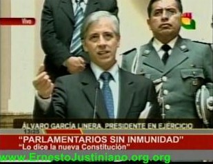 El Vicepresidente de la República, Álvaro García Linera, manifestó que los diputados Pablo Banegas y Bernardo Montenegro no gozan de impunidad diplomática en la nueva Constitución Política del Estado (CPE), estos dos son acusados de falsificar la firma de una policía (Marilyn Vargas, alias “Karen”).
