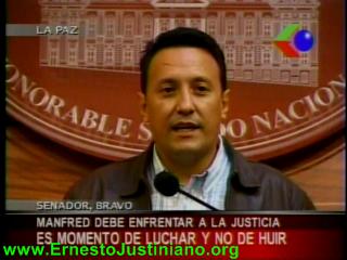 El senador, Paulo Bravo, señaló que Manfred Reyes Villa, debería presentarse, dar la cara ante la justicia y enfrentarse al Gobierno como lo hizo el ex Prefecto Leopoldo Fernández en su momento y no escapar. Bravo dijo que es cierto que hoy en día la justicia no da garantías, pero huyendo, Manfred no ganará nada.