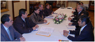 Encuentro: de izq. a der., dos técnicos del OEP; la vocal Ybarnegaray; el Presidente del OEP, Antonio Costas, y la vocal Oporto reunidos con autoridades del Gobierno