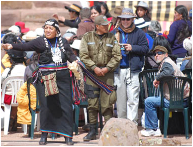 Concentración: turistas y una indígena ecuatoriana antes del inicio de la ceremonia en Kalasasaya