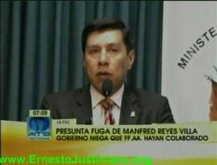 “El personal de las FF.AA. es un personal altamente disciplinado, es un personal que tiene un mando jerárquico, que en los 4 años del Gobierno del Presidente Morales ha demostrado mucha firmeza y no se ha dado en ningún caso este tipo de hipótesis. Si algún miembro de FF.AA. haría esto, se expondría a un caso de encubrimiento, porque Manfred Reyes Villa tenía orden de arraigo, por consiguiente no podía dejar el país. Terminaría su carrera militar y entraría a la cárcel”.