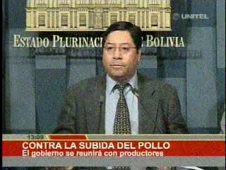 ‘Tenemos los elementos legales por una parte, hay conversaciones con el sector avícola por otra parte, esperemos que se pueda llegar a acuerdos razonables y felices para la población. Vamos adoptar cualquier medida a objeto de garantizar precios justos de estos productos para la canasta familiar’ indicó Luis Arce, ministro de economía. (Unitel)