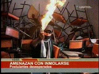 AMENAZAN CON QUEMARSE, LOS POSTULANTES A LAS NORMALES NO RETROCEDEN EN SU PROTESTA. Octavo día de huelga, ahora amenazan con echarse gasolina si no otorgan más cupos de ingreso. El dirigente del sector Víctor Montes niega haber recibido dinero ni ofreció cupos a los estudiantes, como lo había denunciado el Viceministro Torrico. (Unitel)