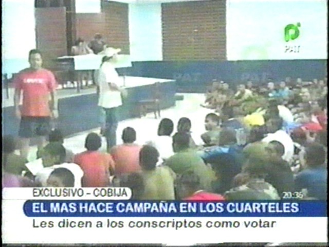EL MAS HACE POLITICA EN LOS CUARTELES, incluso en días de restricción electoral, dos candidatos masistas enseñan a los soldados cómo votar en Pando. El organismo electoral analiza el caso en Sala Plena. (Uno)