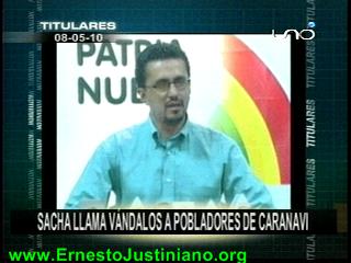 Titulares de Televisión, 08/05/10. TV: Red Uno, Unitel, Canal 7, PAT, Megavisión. Arde Caranavi. Sacha llama vándalos a los de Caranavi. Critican desbloqueo violento. Paro desde el lunes. Salud entra a la huelga. Otro golpe al narcotráfico. Agresión armada a la policía. Gobierno desmiente a los dirigentes.