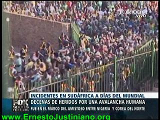 La desgracia marcó el amistoso entre Nigeria y Corea del Norte que tuvo lugar en Johannesburgo. Varios aficionados resultaron heridos al intentar acceder al estadio en el que se disputaba el encuentro. Se ha informado de que otras 14 personas resultaron heridas, de las que una se encuentra en estado grave. En el momento del incidente, ambas selecciones salían al campo de juego y ninguno de los jugadores ni el cuerpo técnico se enteró de lo sucedido y por eso el partido no fue suspendido. Luego la FIFA difundió un comunicado aclarando que este amistoso no tenía nada que ver con el Mundial 2010 y que ese ente no se encargó de la venta de entradas.
