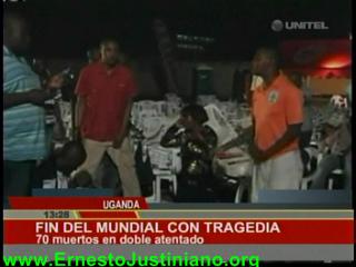 Al menos 70 personas han muerto este domingo, a consecuencia de dos explosiones registradas en otros tantos bares de la capital de Uganda, Kampala, que se encontraban llenos de gente que seguía la final del mundial de fútbol entre España y Holanda. "Las bombas iban dirigidas a dañar a la gente que seguía el partido", ha asegurado el inspector general de la Policía, Kale Kayihura. Aproximadamente a la misma hora se produjeron dos explosiones. Una en el restaurante Ethiopian Village y otra en el bar de un club de rugby. Los dos establecimientos suelen frecuentarlos extranjeros. Al menos uno de los muertos es de nacionalidad estadounidense.