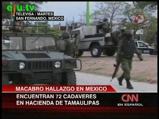 Militares mexicanos encontraron 72 cadáveres, entre ellos 14 mujeres, en un rancho del estado de Tamaulipas (noreste), fronterizo con Estados Unidos, en el peor hallazgo de la campaña contra el narcotráfico emprendida a finales de 2006 por el presidente Felipe Calderón. En el rancho "fueron encontrados los cuerpos sin vida de 72 personas (58 hombres y 14 mujeres)", reportó la Secretaría de Marina Armada en un comunicado, sin brindar más detalles. El macabro descubrimiento ocurrió tras un tiroteo entre efectivos de la marina y pistoleros en el que falleció un soldado y tres presuntos sicarios.