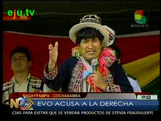 "Qué culpa tiene el Gobierno Nacional si hay un problema entre Oruro y Potosí, pero usan eso y su plan que me estoy quejando y quiero que sepan como mis hermanos; que es su plan, con ese motivo querer desgastar como sea al Evo Morales", dijo el Jefe de Estado desde Mizque ante una masiva concurrencia. Morales agregó que su administración gubernamental no es responsable del conflicto de límites que movilizó a Potosí en procura de quedarse con el cerro Pahua en el municipio de Coroma, rico en yacimiento de piedra caliza, materia prima para la fabricación de cemento. "Yo no soy ningún responsable ni el gobierno nacional.
