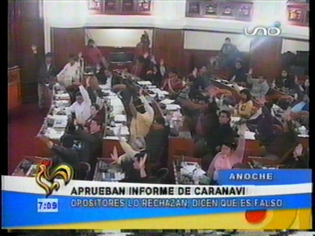 ESTA MADRUGADA LA APLANADORA OFICIALISTA EN LA CÁMARA DE DIPUTADOS APROBO INFORME SOBRE EL CASO CARANAVI que libera de pena y culpa al ministro de Gobierno, Sacha Llorenti, al comandante de la Policía, Oscar Nina, no obstante que existen dos personas que fueron ultimadas por parte de los disparos que salieron específicamente del sector donde se encontraban los policías durante la represión a los movilizados.