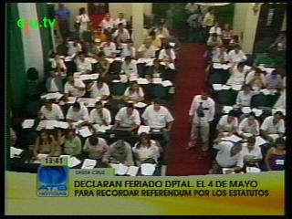 La Asamblea Departamental, aprobó la declaración de feriado departamental el 4 de mayo, para recordar el Referéndum por los Estatutos Autonómicos. El Presidente de la Asamblea Departamental, Alcides Villagómez, señaló que se declara feriado departamental el 4 de mayo sin suspensión de actividades y solo con una tolerancia de media jornada laboral.