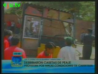 Mototaxistas y choferes de trufis bloquearon la doble vía a La Guardia como medida de protesta por las malas condiciones de la carretera. Los manifestantes hoy derribaron las casetas donde se cobra peajes (kilómetro 13) en el ingreso a la localidad de Camiri.