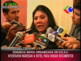 La Diputada de PPB-Convergencia, Norma Piérola, hoy con lagrimas en los ojos denunció que la madrugada de este jueves, agentes de inteligencia trataron de ingresar a su hotel para tratar de secuestrar documentación en torno a presuntas irregularidades y corrupción que habrían sido cometidas en la Fuerza Aérea Boliviana (FAB) y en la Dirección General de Aeronáutica Civil (DGAC) en torno a la adquisición de los aviones BAE y por la adquisición de las llantas para dichos aviones. Piérola dijo que los agentes la amenazaron con cortarle la lengua e incluso con atentar contra la vida de sus hijos si es que no devolvía la documentación que tenía en sus manos.