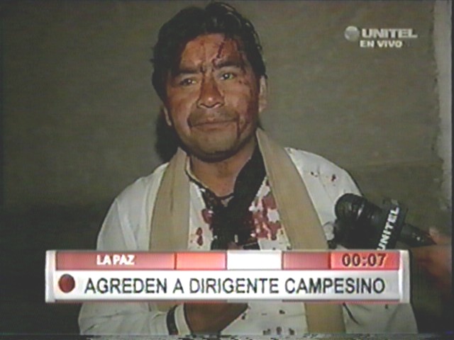 DIRIGENTE DE LA FEDERACION DE CAMPESINOS LEONARDO CALCINA FUE AGREDIDO EN LA PLAZA ALONSO DE MENDOZA Señala que lo redujeron entre 2 personas y le dieron un botellazo en la cabeza, sospecha que fue gente enviada por el gobierno a causa de los cuestionamientos que hace por el pedido de renuncia a 5 ministros.