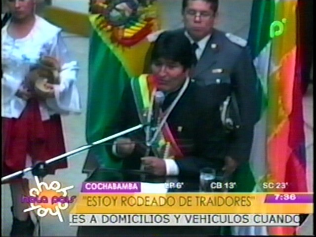 ESTOY RODEADO DE TRAIDORES, así afirmó el presidente Evo Morales en su discurso en la sesión de honor de la Asamblea legislativa de Cochabamba, dijo que está rodeado de traidores que serán reconocidos. (PAT)