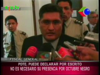 El Fiscal General de la Nación, Mario Uribe, señaló que no es necesario que el Presidente, Evo Morales, asista físicamente al juicio oral por el caso de octubre negro del 2003. Uribe indicó que podría aceptarse, que el Primer Mandatario preste su declaración por este caso, en forma escrita.