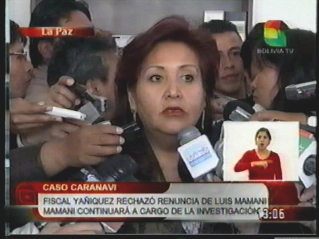 ‘En cuanto a la información de algunos medios señalando que el fiscal Mamani habría sido destituido, incluso que habría sido destituido desde Sucre es falso, en ningún momento el fiscal asignado al caso Caranavi ha sido destituido. El hecho es de que él ha presentado una renuncia a seguir conociendo el caso, empero esa renuncia no ha sido considerada por mi autoridad tomando en cuenta que el artículo 74 de la Ley del Ministerio Público señala con claridad en qué forma y en qué casos el fiscal puede excusarse, y en este caso no se ha cumplido con la norma. Consiguientemente se le está devolviendo al fiscal previamente cumpla con lo dispuesto la normativa que rige el país’, señaló la fiscal. (Erbol)