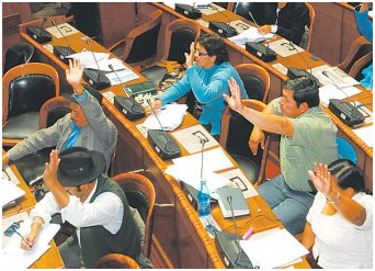 MAYORÍA. Los asambleístas del oficialismo aprueban con la mano en alto el proyecto de ley que fue debatido durante 12 horas.