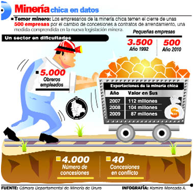 “Se pretende cerrar las empresas de la minería chica que mayor cantidad de empleos genera en el sector”, expresó el presidente de la Cámara Departamental de Minería de Oruro, Gonzalo Quintela, en referencia al proyecto anunciado por el ministro del sector, José Pimentel.
