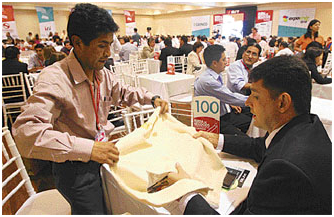 El empresario peruano José Luis Jacobs, Gerente comercial de Cemip Bolivia, se muestra satisfecho por las 13 citas que tiene hasta mañana. Ofrece ropa urbana elaborada con mano de obra boliviana, ya que su taller se encuentra en La Paz.