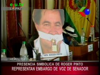 Luego de que se le revocara el arresto domiciliario, al senador opositor, Roger Pinto, en la ciudad de Cobija, sus colegas senadores hoy en el hemiciclo parlamentario decidieron poner su fotografía en la que está pinto amordazado y con un candado en su boca. El senador, Bernardo Gutiérrez, dijo que el MAS decidió privar de la voz de un senador de oposición que ha estado permanentemente denunciando los abusos y excesos del poder central.