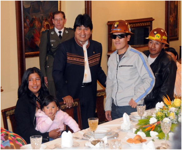 El presidente Evo Morales recibe al minero Carlos Mamani y a sus familiares en Palacio de Gobierno, donde almorzaron junto con otras autoridades del Estado. (foto Abi)