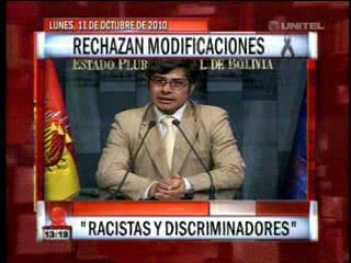 ‘Quienes están en este momento promoviendo la recolección de firmas y alentando un referéndum o una iniciativa legislativa están equivocados, el pueblo boliviano el pasado 25 de enero del año 2009 ha votado con un referéndum la aprobación de la nueva Constitución, la Constitución determina que tengamos forma de lucha contra el racismo y la discriminación, ya se ha votado aquello, ha habido millones de personas que han afirmado afirmativamente su voto para que se luche contra el racismo y la discriminación. Pretender una iniciativa legislativa que vulnere o en todo caso extirpe los artículos 16 o 23 de la Ley 045 de Lucha Contra el Racismo es ir contra la Constitución’, señaló.