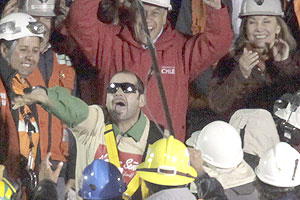 El minero, quien hacía de "presentador" en los videos que enviaban los 33, comenzó a gritar "Viva Chile, mierda" cuando aún iba ascendiendo por el ducto.