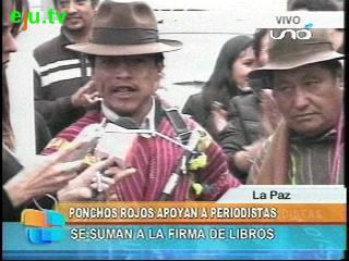 Los ponchos rojos de La Paz están apoyando la libertad de expresión, el derecho ciudadano y la movilización encabezada por los periodistas. Esta mañana un grupo de ponchos rojos se apersonó a firmar los libros en favor a la libertad de expresión.