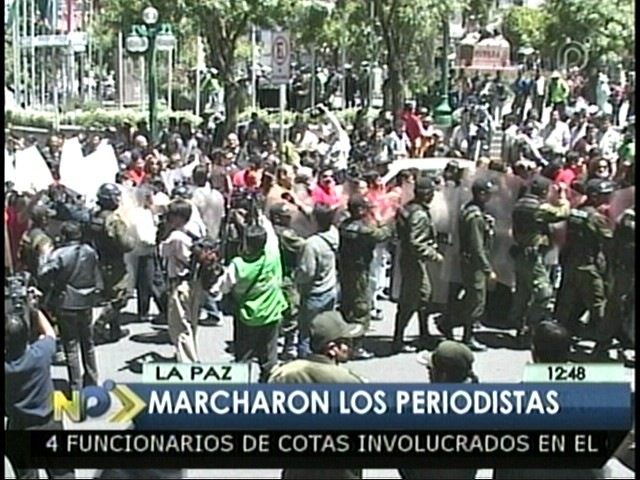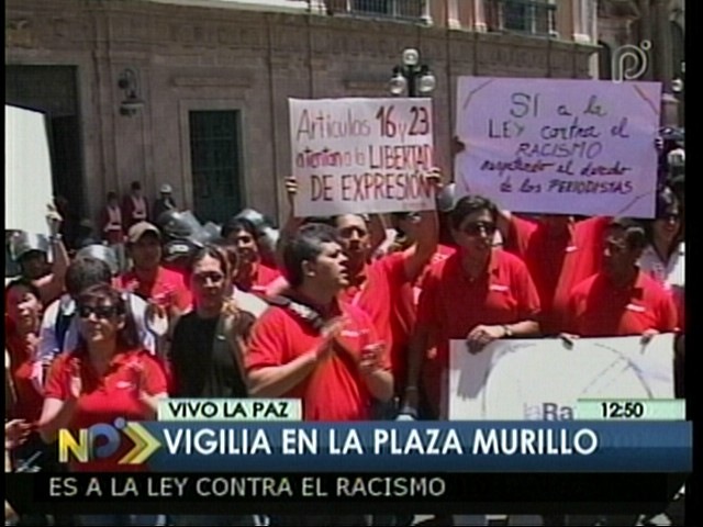 Hasta pasado el mediodía los periodistas paceños protagonizaron una marcha en Plaza Murillo pidiendo respeto a la libertad de prensa y que definitivamente no se tomen en cuenta los artículos 16 y 23 de la Ley Contra el Racismo y toda forma de Discriminación.