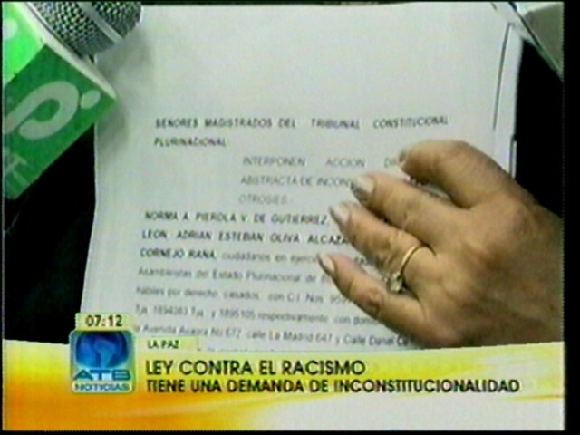 DIPUTADA NORMA PIEROLA ANUNCIA UN RECURSO DE INCONSTITUCIONALIDAD EN CONTRA DE LOS ARTICULOS DE LA LEY CONTRA EL RACISMO. El MAS por su parte asegura que la nueva ley es plenamente constitucional.
