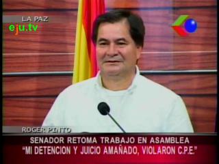 Después de haber cumplido más de 45 días de arresto domiciliario, el senador opositor pandino, Roger Pinto, retornó su curul en la Camara de Senadores. Pinto señaló el juicio en su contra fue digitado por el Gobierno y de que se violó la Constitución Política del Estado al haberse determinado su detención domiciliaria por un proceso que existe en su contra en el departamento de Pando. El senador dijo que a partir de la fecha sesionará para tratar de recobrar el tiempo perdido.