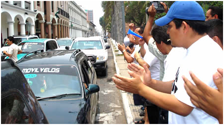 El transporte público y privado brindó un ‘espaldarazo’ a los trabajadores de la prensa que cumplen 12 días de huelga de hambre pidiendo libertad de expresión. Las muestras de apoyo mediante el ‘Bocinazo por la Libertad de Expresión’ fue emotivo en las calles de Santa Cruz.